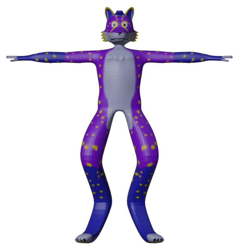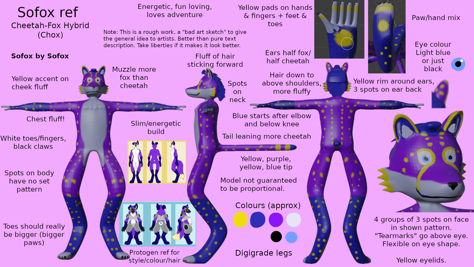 Standard purple base colour, but with more cheetah-like markings. Switch the dark spots and tearmarks to yellow, contrasting well with the purple. Give them "socks" like a fox has, but also white fingers and toes becuase they looked really good in this pic. Ears took a bit of fidgeting, but decided on yellow rims to the ears, just like cheetah ears have black rims on their ears.