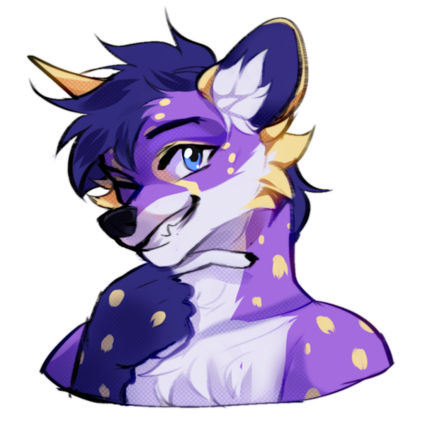 I would limit the colours: purple, yellow, dark blue, black, and off white. These were the colours used on the protogen (and I had leftover fur for). Keep the colours limited so things didn't get overcomplicated (I later had to add light blue because I forgot about the eye colour). Red and brown, both colours I like (and that actually go well with me when I wear real world clothing), are not present in the design, but can always be added as clothing. A good character has a strong base that you can build off of. I wanted my sona clothed unless the art universe/style worked better naked.